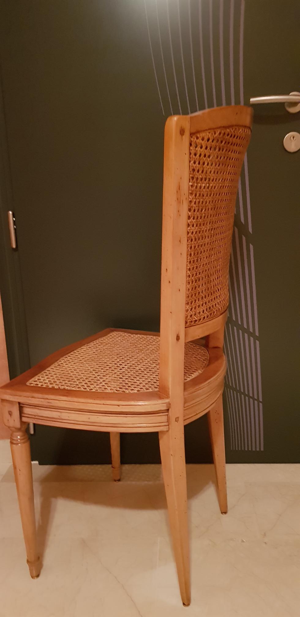 Voici ma table régence en merisier et mes chaises cannées relookées.